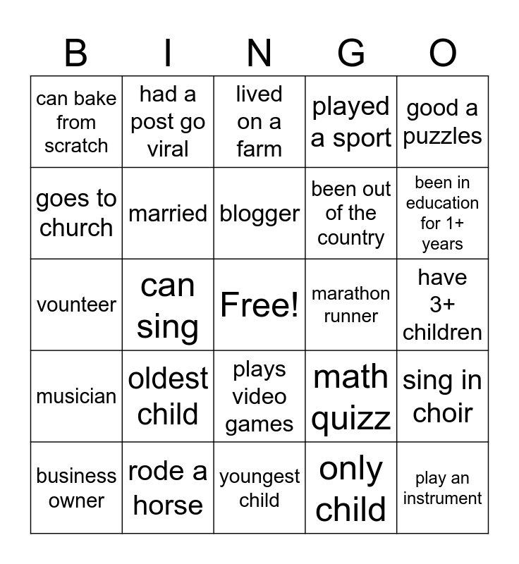 This bingo card has a free space and 24 words: oldest child, rode a horse, blogger, business owner, good a puzzles, can bake from scratch, goes to church, had a post go viral, marathon runner, plays video games, been out of the country, vounteer, math quizz, sing in choir, married, only child, have 3+ children, lived on a farm, been in education for 1+ years, can sing, play an instrument, musician, played a sport and youngest child.