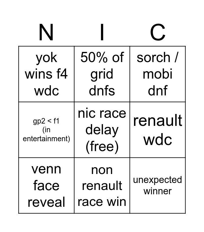 This bingo card has a free space and 8 words: renault wdc, sorch / mobi dnf, 50% of grid dnfs, venn face reveal, yok wins f4 wdc, unexpected winner, gp2 < f1 (in entertainment) and non renault race win.