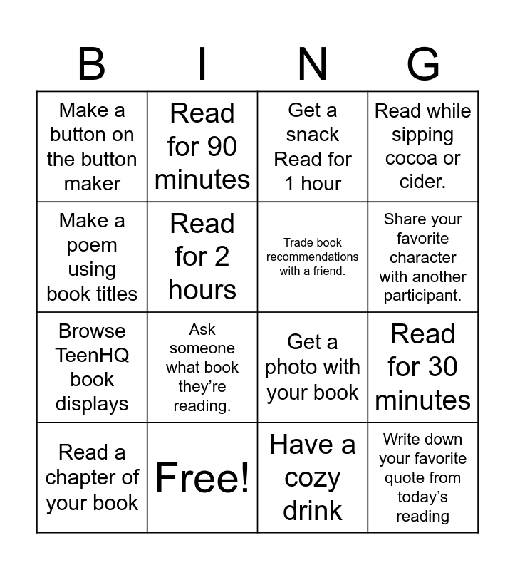 This bingo card has 16 words: Free!, Read for 30 minutes, Get a snack Read for 1 hour, Make a button on the button maker, Browse TeenHQ book displays, Read for 90 minutes, Get a photo with your book, Have a cozy drink, Make a poem using book titles, Read for 2 hours, Read a chapter of your book, Read while sipping cocoa or cider., Ask someone what book they’re reading., Share your favorite character with another participant., Trade book recommendations with a friend. and Write down your favorite quote from today’s reading.