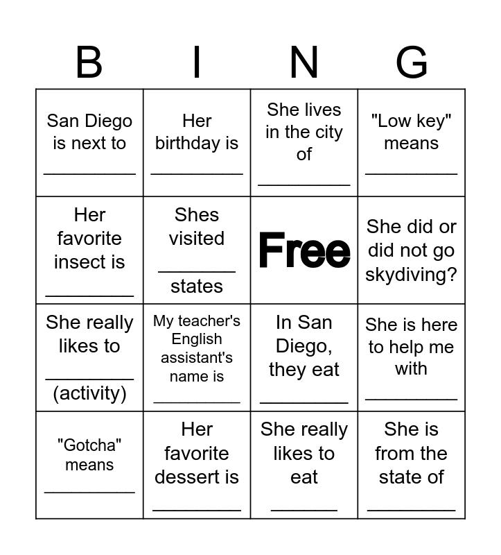This bingo card has 18 words: My teacher's English assistant's name is __________, She is from the state of ________, She lives in the city of _________, San Diego is next to _________, In San Diego, they eat ________, "Low key" means _________, "Gotcha" means __________, Her birthday is _________, She did or did not go skydiving?, She really likes to ________ (activity), She really likes to eat ______, Her favorite insect is ________, She is here to help me with _________, Shes visited _______ states, Free, She did or did not raise a pig?, Her favorite dessert is ________ and Her favorite holiday is _______.