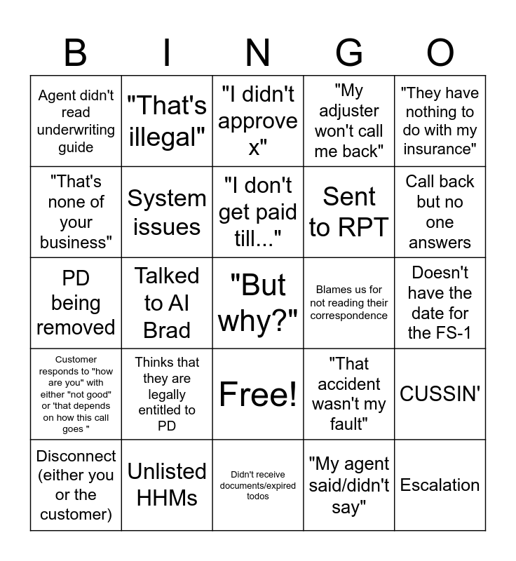 This bingo card has 26 words: Free!, "My agent said/didn't say", "I don't get paid till...", Unlisted HHMs, "They have nothing to do with my insurance", Agent didn't read underwriting guide, "That's none of your business", "That's illegal", Doesn't have the date for the FS-1, "That accident wasn't my fault", Sent to RPT, PD being removed, CUSSIN', Disconnect (either you or the customer), Talked to AI Brad, Billie Jean, "My adjuster won't call me back", Customer responds to "how are you" with either "not good" or 'that depends on how this call goes ", "I didn't approve x", "But why?", Call back but no one answers, Didn't receive documents/expired todos, Blames us for not reading their correspondence, Thinks that they are legally entitled to PD, System issues and Escalation.