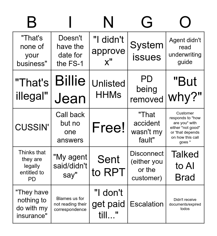 This bingo card has a free space and 25 words: "My agent said/didn't say", "I don't get paid till...", Unlisted HHMs, "They have nothing to do with my insurance", Agent didn't read underwriting guide, "That's none of your business", "That's illegal", Doesn't have the date for the FS-1, "That accident wasn't my fault", Sent to RPT, PD being removed, CUSSIN', Disconnect (either you or the customer), Talked to AI Brad, Billie Jean, "My adjuster won't call me back", Customer responds to "how are you" with either "not good" or 'that depends on how this call goes ", "I didn't approve x", "But why?", Call back but no one answers, Didn't receive documents/expired todos, Blames us for not reading their correspondence, Thinks that they are legally entitled to PD, System issues and Escalation.