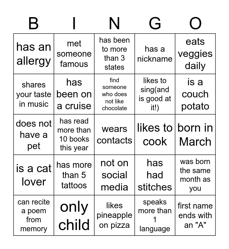 This bingo card has 25 words: is a cat lover, only child, wears contacts, speaks more than 1 language, eats veggies daily, has an allergy, met someone famous, has been to more than 3 states, likes to cook, was born the same month as you, shares your taste in music, has been on a cruise, likes pineapple on pizza, has had stitches, is a couch potato, can recite a poem from memory, has read more than 10 books this year, find someone who does not like chocolate, likes to sing(and is good at it!), born in March, does not have a pet, has more than 5 tattoos, not on social media, has a nickname and first name ends with an "A".