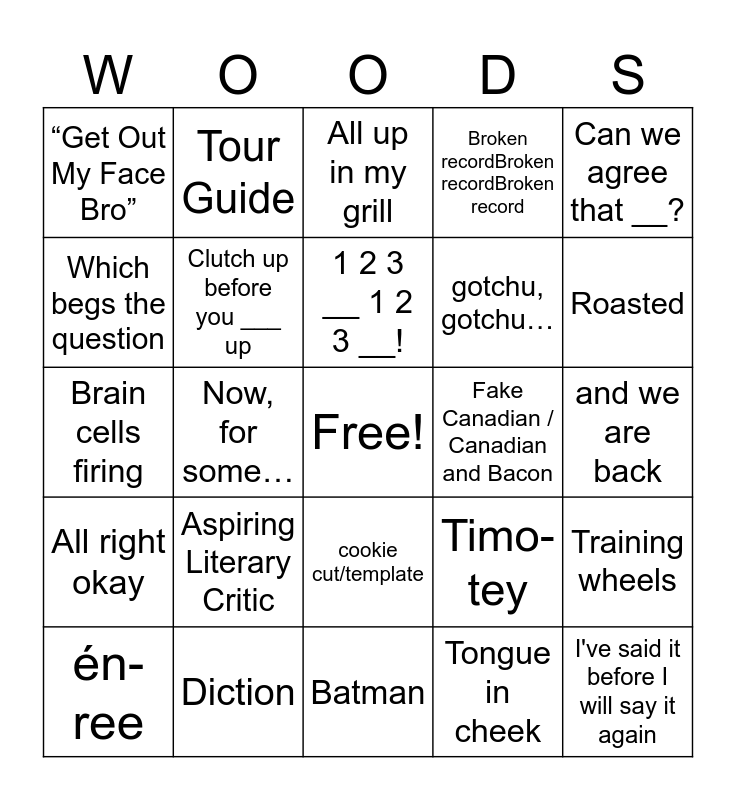 This bingo card has a free space and 53 words: Proverbial, I've said it before I will say it again, But here's the thing, Tongue in cheek, Aspiring Literary Critic, “Bad Person”, Tour Guide, smərt, Which begs the question, Work with me, Clutch up before you ___ up, I'm glad you asked, Training wheels, Timo-tey, Quite literally, én-ree, 1 2 3 __ 1 2 3 __!, Fake Canadian / Canadian and Bacon, Get out of here, Can we agree that __?, Now, for some…, Mentions Juliet’s birthday, gotchu, gotchu…, “Get Out My Face Bro”, “The Wife”, Diction, Mentions the window, I just taught freshmen so…, It HAS to, Roasted, Non-negotiable, It’d be an insult to ___, I see you, Mentions the zoo, Things of that nature, Mentions parallel universe / Earth 2, Broken recordBroken recordBroken record, Batman, All up in my grill, Having said that/with that being said, Mentions bank robbers (not just bank), in other words, and we are back, smorgusbord or chicken or wing dings, ET Phone Home, cookie cut/template, STOP IT, “Absolutely positively”, Brain cells firing, All right okay, Put me in coach, And by __ I mean __ and Bless me because its not about you.
