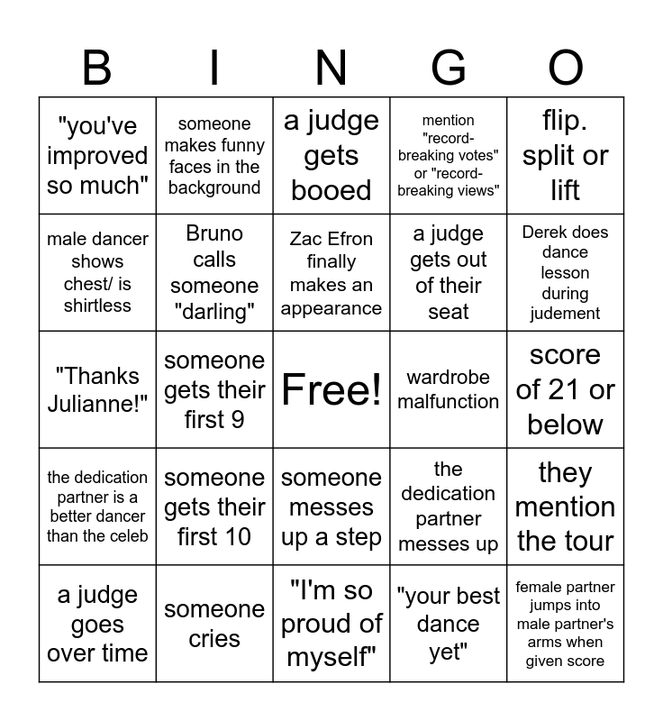 This bingo card has a free space and 30 words: someone cries, surprising celebrity cameo, someone gets their first 9, a score of 27 or above, "you've improved so much", a judge gets booed, Bruno calls someone "darling", someone messes up a step, wardrobe malfunction, "I'm so proud of myself", score of 21 or below, female partner jumps into male partner's arms when given score, "your best dance yet", voting is mentioned more than 5 times, Derek does dance lesson during judement, Judges all give the same score, the dedication partner messes up, the dedication partner is a better dancer than the celeb, someone gets their first 10, flip. split or lift, "Thanks Julianne!", commercial break before given a score, someone makes funny faces in the background, a judge gets out of their seat, male dancer shows chest/ is shirtless, mention "record-breaking votes" or "record-breaking views", they mention the tour, a judge goes over time, Zac Efron finally makes an appearance and Julianne asks an insane question.
