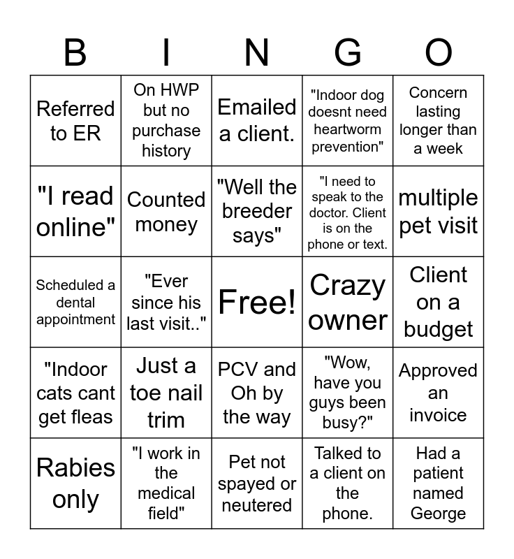 This bingo card has a free space and 24 words: Just a toe nail trim, "I work in the medical field", "Well the breeder says", Rabies only, Concern lasting longer than a week, Referred to ER, "I read online", On HWP but no purchase history, Crazy owner, PCV and Oh by the way, "I need to speak to the doctor. Client is on the phone or text., Scheduled a dental appointment, "Wow, have you guys been busy?", Approved an invoice, Counted money, Talked to a client on the phone., Client on a budget, Emailed a client., multiple pet visit, "Ever since his last visit..", Had a patient named George, "Indoor cats cant get fleas, "Indoor dog doesnt need heartworm prevention" and Pet not spayed or neutered.