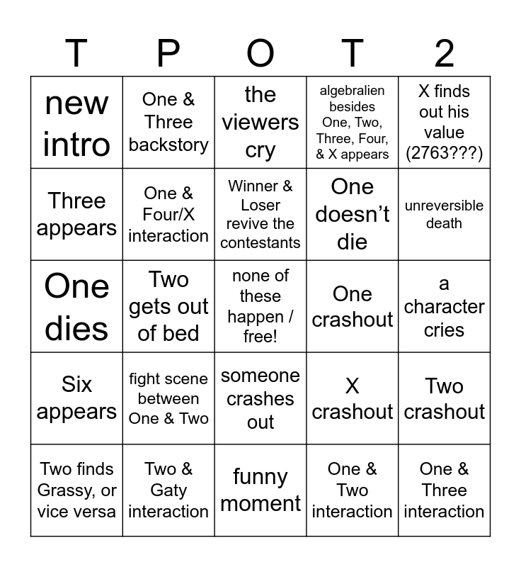 This bingo card has a free space and 24 words: fight scene between One & Two, Two & Gaty interaction, Winner & Loser revive the contestants, Two finds Grassy, or vice versa, X finds out his value (2763???), new intro, Three appears, One & Three backstory, One crashout, someone crashes out, One doesn’t die, One dies, X crashout, Two crashout, One & Four/X interaction, One & Two interaction, a character cries, the viewers cry, unreversible death, Two gets out of bed, One & Three interaction, Six appears, algebralien besides One, Two, Three, Four, & X appears and funny moment.