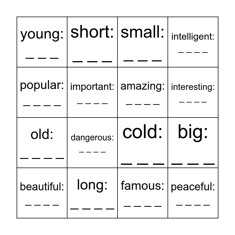 This bingo card has 16 words: long: _ _ _ _, big: _ _ _, small: _ _ _, young: _ _ _, old: _ _ _ _, short: _ _ _, cold: _ _ _, famous: _ _ _ _, popular: _ _ _ _, important: _ _ _ _, beautiful: _ _ _ _, intelligent: _ _ _ _, dangerous: _ _ _ _, interesting: _ _ _ _, amazing: _ _ _ _ and peaceful: _ _ _ _.