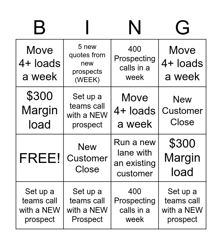 This bingo card has 18 words: New Customer Close, Set up a teams call with a NEW prospect, 400 Prospecting calls in a week, Move 4+ loads a week, Run a new lane with an existing customer, Move 4+ loads a week, Set up a teams call with a NEW prospect, 5 new quotes from new prospects (WEEK), New Customer Close, FREE!, 400 Prospecting calls in a week, $300 Margin load, $300 Margin load, Set up a teams call with a NEW prospect, Move 4+ loads a week, 5 new quotes from new prospects (WEEK), Set up a teams call with a NEW Prospect and 5 new quotes from new prospects.