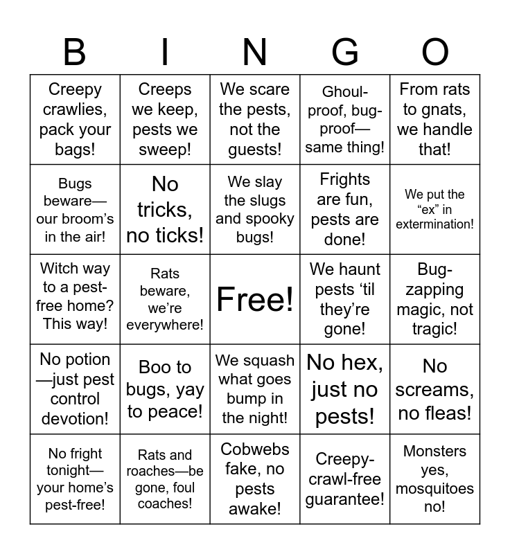 This bingo card has a free space and 29 words: No fright tonight—your home’s pest-free!, Spiders spin, but not with me in!, Rats beware, we’re everywhere!, Ghosts welcome—bugs beware!, Creepy crawlies, pack your bags!, We scare the pests, not the guests!, No tricks, no ticks!, Boo to bugs, yay to peace!, We haunt pests ‘til they’re gone!, Rats and roaches—be gone, foul coaches!, Bug-zapping magic, not tragic!, Monsters yes, mosquitoes no!, Cobwebs fake, no pests awake!, Creepy-crawl-free guarantee!, We put the “ex” in extermination!, Haunted? Sure. Infested? Never!, We squash what goes bump in the night!, No potion—just pest control devotion!, From rats to gnats, we handle that!, Witch way to a pest-free home? This way!, No hex, just no pests!, If it creeps or crawls—we handle it all!, Frights are fun, pests are done!, Bugs beware—our broom’s in the air!, Ghoul-proof, bug-proof—same thing!, Creeps we keep, pests we sweep!, No screams, no fleas!, We slay the slugs and spooky bugs! and From haunted halls to cozy homes—we keep pests gone to the bones!.