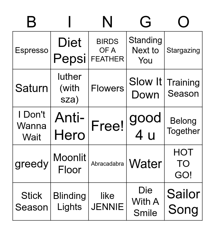 This bingo card has a free space and 30 words: Blinding Lights, Watermelon Sugar, Anti-Hero, APT., Espresso, BIRDS OF A FEATHER, luther (with sza), Abracadabra, good 4 u, like JENNIE, Belong Together, Sailor Song, Die With A Smile, Apple, Training Season, Alibi (with Pablo), Water, greedy, Moonlit Floor, Stargazing, I Don't Wanna Wait, From The Start, Diet Pepsi, Slow It Down, Saturn, Standing Next to You, HOT TO GO!, Stick Season, Flowers and golden hour.