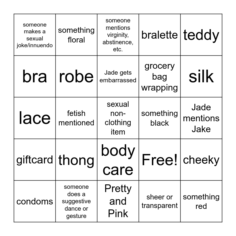 This bingo card has 25 words: thong, Pretty and Pink, Jade gets embarrassed, condoms, teddy, someone makes a sexual joke/innuendo, bra, something floral, something black, body care, grocery bag wrapping, lace, Free!, cheeky, robe, something red, Jade mentions Jake, someone mentions virginity, abstinence, etc., silk, fetish mentioned, sexual non-clothing item, someone does a suggestive dance or gesture, giftcard, bralette and sheer or transparent.