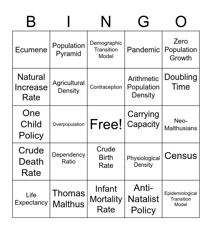 This bingo card has a free space and 25 words: Dependency Ratio, Infant Mortality Rate, Contraception, Life Expectancy, Zero Population Growth, Ecumene, Natural Increase Rate, Population Pyramid, Carrying Capacity, Crude Birth Rate, Arithmetic Population Density, One Child Policy, Physiological Density, Census, Agricultural Density, Pro-Natalist Policy, Neo-Malthusians, Demographic Transition Model, Doubling Time, Overpopulation, Epidemiological Transition Model, Thomas Malthus, Crude Death Rate, Pandemic and Anti-Natalist Policy.