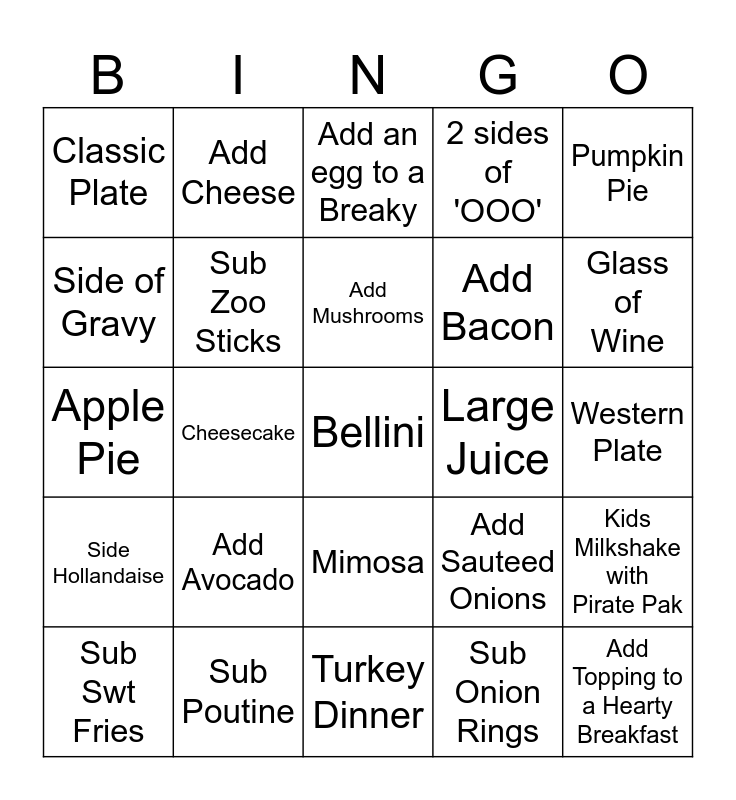 This bingo card has 25 words: Side Hollandaise, Sub Poutine, Bellini, Sub Onion Rings, Pumpkin Pie, Classic Plate, Add Cheese, Add an egg to a Breaky, Large Juice, Kids Milkshake with Pirate Pak, Side of Gravy, Sub Zoo Sticks, Turkey Dinner, Add Sauteed Onions, Glass of Wine, Sub Swt Fries, Cheesecake, Add Mushrooms, Add Bacon, Western Plate, Apple Pie, Add Avocado, Mimosa, 2 sides of 'OOO' and Add Topping to a Hearty Breakfast.