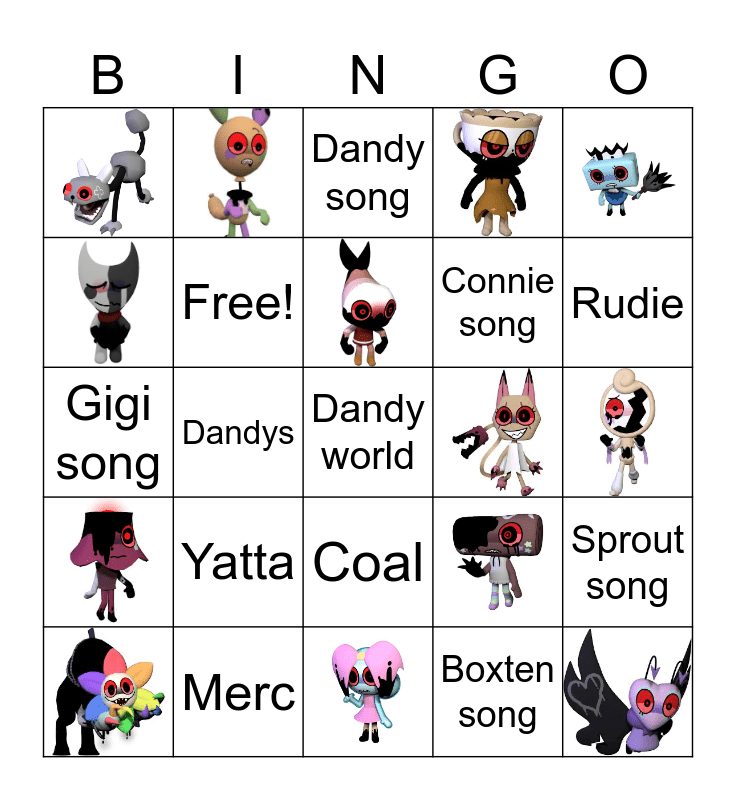 This bingo card has 24 images and 49 words: Free!, Bassie, Cocoa, Dyle, Eggson, Flyte, Merc, Poy, Pingwi, Dandy’s, Dandys, Dandy’s world, Dandys world, Dandy, Dandy world, Astro song, Boxten song, Yatta, Coal, Yatta song, Coal song, Connie song, Dandy song, Dandy world, Finn song, Gigi song, Dandy’s song, Dandys song, Ginger, Ginger song, Glisten song, Goob song, Looey song, Coal, Coal song, Pebble song, Poppy song, Razzle and dazzle song, Rodger song, Rudie, Rudie song, Scraps song, Shelly song, Shrimpo song, Sprout song, Teagan song, Tisha song, Toodles song and Vee song.