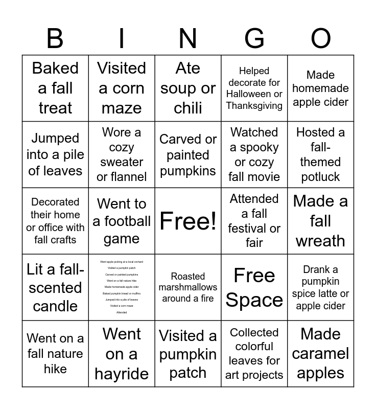 This bingo card has a free space and 25 words: Went apple picking at a local orchard Visited a pumpkin patch Carved or painted pumpkins Went on a fall nature hike Made homemade apple cider Baked pumpkin bread or muffins Jumped into a pile of leaves Visited a corn maze Attended, Visited a pumpkin patch, Carved or painted pumpkins, Went on a fall nature hike, Made homemade apple cider, Baked a fall treat, Jumped into a pile of leaves, Visited a corn maze, Attended a fall festival or fair, Roasted marshmallows around a fire, Watched a spooky or cozy fall movie, Decorated their home or office with fall crafts, Free Space, Drank a pumpkin spice latte or apple cider, Wore a cozy sweater or flannel, Took a scenic drive to see fall colors, Made a fall wreath, Ate soup or chili, Hosted a fall-themed potluck, Went to a football game, Made caramel apples, Went on a hayride, Lit a fall-scented candle, Helped decorate for Halloween or Thanksgiving and Collected colorful leaves for art projects.