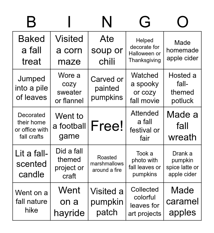 This bingo card has a free space and 25 words: Did a fall themed project or craft, Visited a pumpkin patch, Carved or painted pumpkins, Went on a fall nature hike, Made homemade apple cider, Baked a fall treat, Jumped into a pile of leaves, Visited a corn maze, Attended a fall festival or fair, Roasted marshmallows around a fire, Watched a spooky or cozy fall movie, Decorated their home or office with fall crafts, Took a photo with fall leaves or pumpkins, Drank a pumpkin spice latte or apple cider, Wore a cozy sweater or flannel, Took a scenic drive to see fall colors, Made a fall wreath, Ate soup or chili, Hosted a fall-themed potluck, Went to a football game, Made caramel apples, Went on a hayride, Lit a fall-scented candle, Helped decorate for Halloween or Thanksgiving and Collected colorful leaves for art projects.
