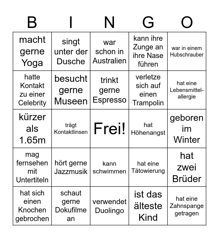 This bingo card has a free space and 24 words: hört gerne Jazzmusik, schaut gerne Dokufilme an, trinkt gerne Espresso, hat sich einen Knochen gebrochen, war in einem Hubschrauber, macht gerne Yoga, hatte Kontakt zu einer Celebrity, singt unter der Dusche, hat Höhenangst, kann schwimmen, verletze sich auf einen Trampolin, kürzer als 1.65m, hat eine Tätowierung, hat zwei Brüder, besucht gerne Museen, ist das älteste Kind, geboren im Winter, war schon in Australien, hat eine Lebensmittel-allergie, trägt Kontaktlinsen, hat eine Zahnspange getragen, mag fernsehen mit Untertiteln, kann ihre Zunge an ihre Nase führen and verwendet Duolingo.