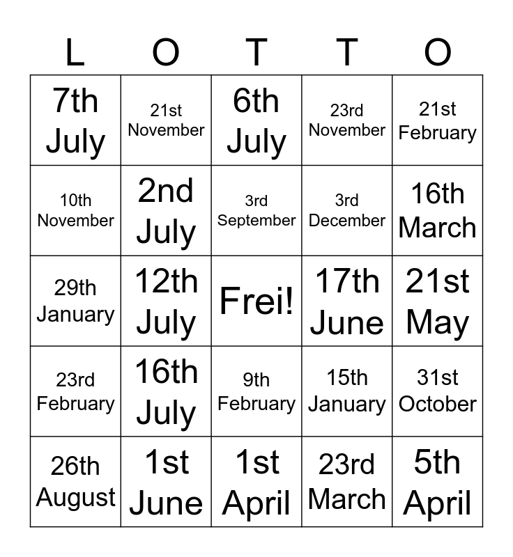 This bingo card has a free space and 29 words: 26th August, 17th August, 12th July, 8th July, 7th July, 6th July, 2nd July, 16th July, 17th June, 1st June, 21st May, 5th April, 1st April, 23rd March, 16th March, 5th February, 9th February, 23rd February, 21st February, 29th January, 15th January, 20th December, 3rd December, 10th November, 23rd November, 21st November, 31st October, 3rd September and 28th August.