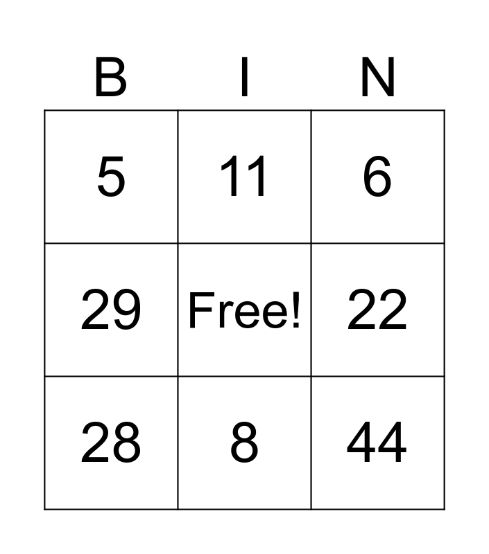 This bingo card has 24 words: 30, 12, 8, 17, Free!, 5, 22, 11, 40, 31, 44, 26, 3, 14, 28, 39, 9, 6, 67, 45, 57, 21, 29 and 58.