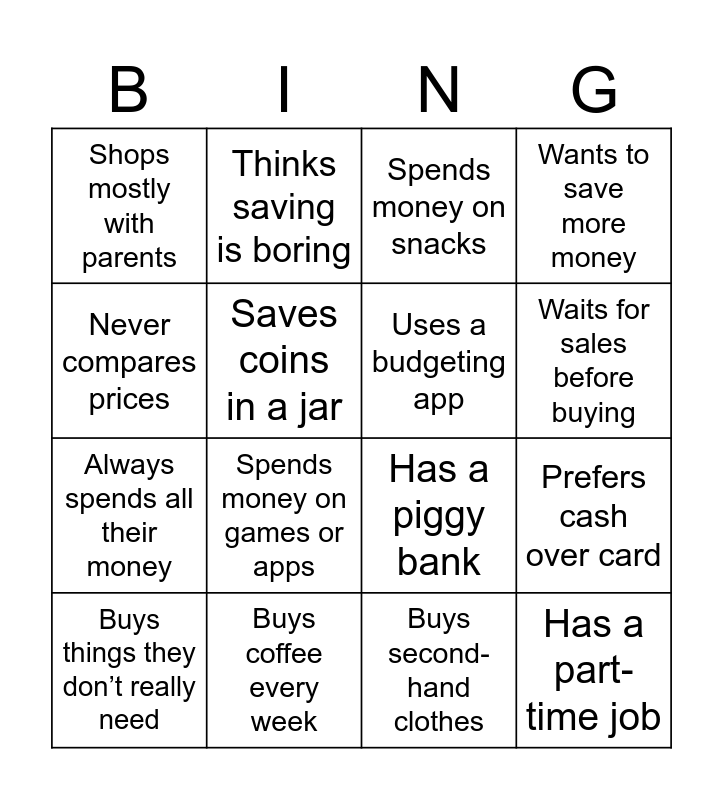 This bingo card has 16 words: Buys coffee every week, Prefers cash over card, Spends money on snacks, Shops mostly with parents, Always spends all their money, Thinks saving is boring, Has a piggy bank, Buys second-hand clothes, Never compares prices, Saves coins in a jar, Buys things they don’t really need, Wants to save more money, Spends money on games or apps, Waits for sales before buying, Uses a budgeting app and Has a part-time job.