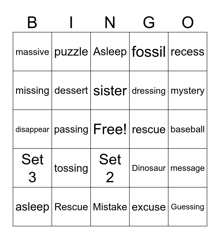This bingo card has a free space and 63 words: basket, pencil, castle, message, desert, lesson, puzzle, listen, sister, music, Set 2, basic, baseball, recess, whisper, missing, passing, massive, cousin, dressing, tossing, Set 3, fossil, guessing, rescue, mosquito, dinosaur, bicycle, inside, outside, mistake, discover, Set 4, history, mystery, asleep, decision, excuse, beside, dessert, disappear, rescue, message, Fossil, Guessing, Rescue, Mosquito, Dinosaur, Bicycle, Inside, Outside, Mistake, Discover, History, Mystery, Asleep, Decision, Excuse, Beside, Dessert, Disappear, Rescue and Message.