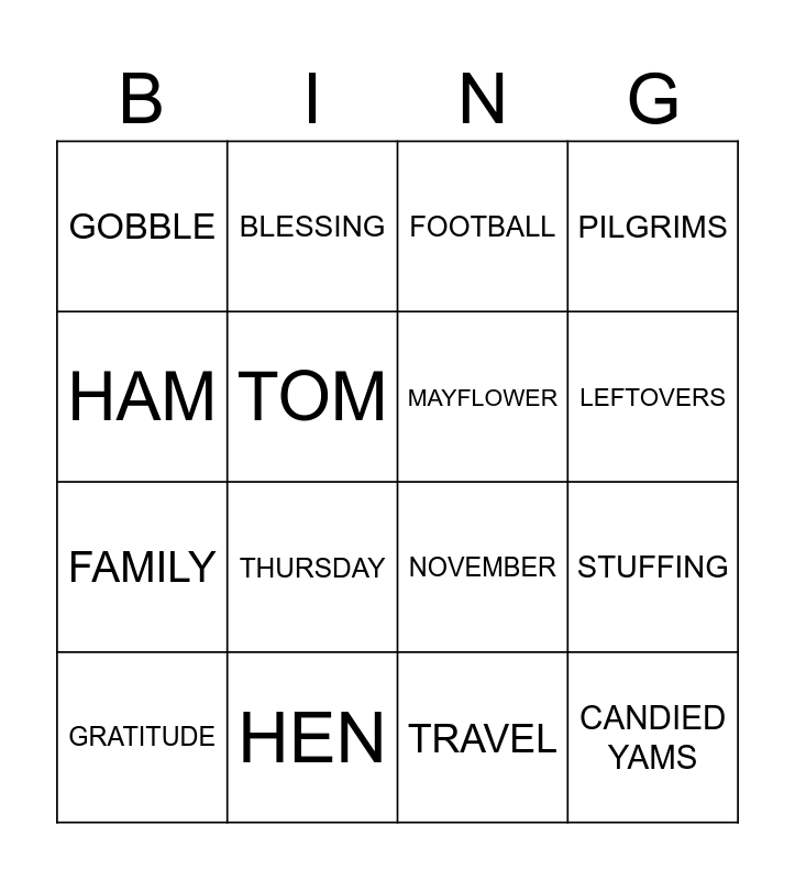 This bingo card has 16 words: HEN, STUFFING, FOOTBALL, GOBBLE, FAMILY, BLESSING, NOVEMBER, TRAVEL, HAM, TOM, GRATITUDE, PILGRIMS, THURSDAY, LEFTOVERS, MAYFLOWER and CANDIED YAMS.