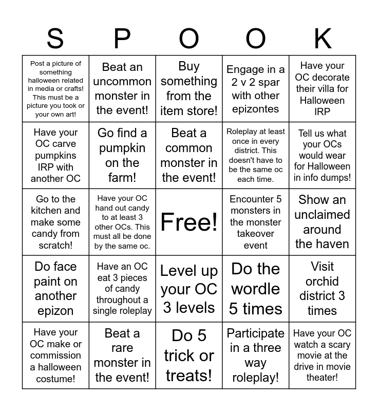 This bingo card has a free space and 24 words: Have an OC eat 3 pieces of candy throughout a single roleplay, Beat a rare monster in the event!, Beat a common monster in the event!, Have your OC make or commission a halloween costume!, Have your OC decorate their villa for Halloween IRP, Post a picture of something halloween related in media or crafts! This must be a picture you took or your own art!, Have your OC carve pumpkins IRP with another OC, Beat an uncommon monster in the event!, Encounter 5 monsters in the monster takeover event, Level up your OC 3 levels, Roleplay at least once in every district. This doesn't have to be the same oc each time., Go to the kitchen and make some candy from scratch!, Do the wordle 5 times, Visit orchid district 3 times, Go find a pumpkin on the farm!, Participate in a three way roleplay!, Show an unclaimed around the haven, Buy something from the item store!, Tell us what your OCs would wear for Halloween in info dumps!, Have your OC hand out candy to at least 3 other OCs. This must all be done by the same oc., Have your OC watch a scary movie at the drive in movie theater!, Do face paint on another epizon, Engage in a 2 v 2 spar with other epizontes and Do 5 trick or treats!.