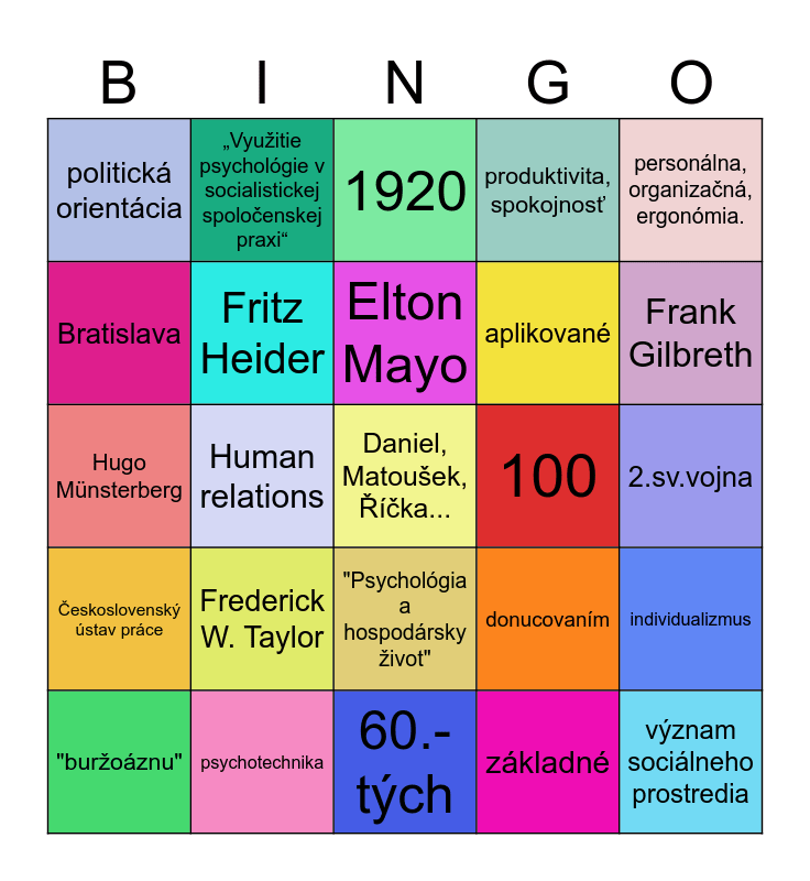 This bingo card has 25 words: Frederick W. Taylor, 60.-tých, Elton Mayo, "buržoáznu", personálna, organizačná, ergonómia., politická orientácia, Bratislava, „Využitie psychológie v socialistickej spoločenskej praxi“, 100, "Psychológia a hospodársky život", aplikované, Hugo Münsterberg, donucovaním, individualizmus, Fritz Heider, význam sociálneho prostredia, 2.sv.vojna, 1920, Frank Gilbreth, Human relations, Daniel, Matoušek, Říčka..., psychotechnika, Československý ústav práce, produktivita, spokojnosť and základné.