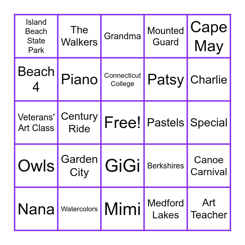 This bingo card has a free space and 42 words: Purple, Connecticut College, Cathedral of the Woods, Garden City, Medford Lakes, Canoe Carnival, Art Teacher, Mom, Grandma, GiGi, Special, Charlie, Century Ride, Cape May, Mohonk Mountain House, Berkshires, Frary Family Association, Veterans' Art Class, Book Group, The Walkers, Beach 4, Washington, D.C., Willingboro, Island Beach State Park, Flora Lea, Tigger, Patsy, Artist, Tex and Toe, The Lake, Bird Watching, Owls, Piano, Mimi, Bobbie, Nana, Watercolors, Pastels, Pet Portraits, Landscapes, Mounted Guard and Millard.