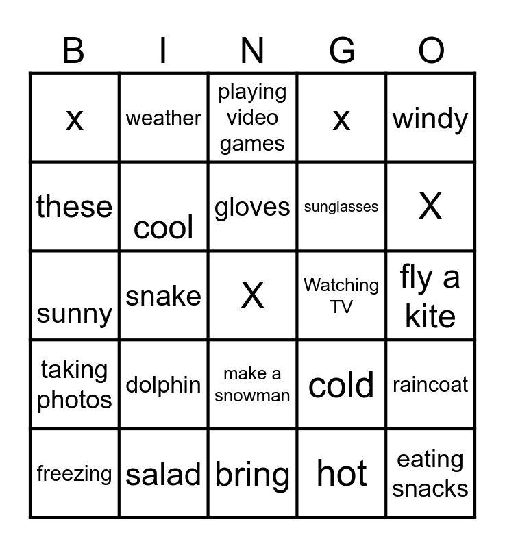 This bingo card has a free space and 24 words: dolphin, salad, gloves, freezing, windy, x, these, weather, Watching TV, make a snowman, sunglasses, sunny, cold, raincoat, cool, hot, fly a kite, playing video games, X, snake, eating snacks, taking photos, x and bring.