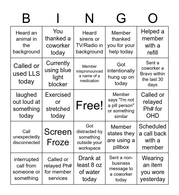 This bingo card has a free space and 29 words: interrupted call from someone or something, Did a little cleaning today, Exercised or stretched today, Had connectivity or IT issues today, Heard an animal in the background, Heard sirens or TV/Radio in background, Currently using blue light blocker, Screen Froze, Member says "I'm not a pill person" or something similar, Called or relayed Ph# for member services, Called or relayed Ph# for OHD, Wearing an item you wore yesterday, Drank at least 8 oz of water today, Sent a non-business message to a coworker today, Sent a coworker a Bravo within the last 30 days, Helped a member with a cost or access issue, Got distracted by something outside your workspace, Call unexpectedly disconnected, Helped a member with a refill, laughed out loud at something today, Member states they are using a pillbox, Informed or answered a question about a UCard., Got intentionally hung up on today, Called or used LLS today, Member thanked you for your help today, You thanked a coworker today, Scheduled a call back with a member, Member mispronounced a name of a medication and member picked up, but no response.