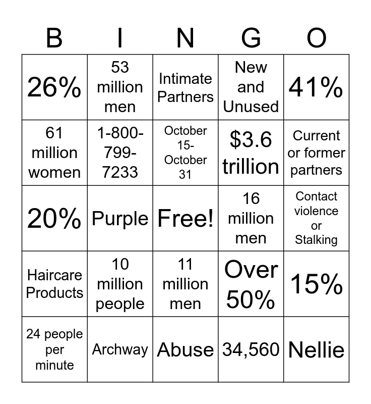 This bingo card has a free space and 24 words: 10 million people, Archway, October 15-October 31, 24 people per minute, 41%, 26%, 61 million women, 53 million men, 16 million men, 11 million men, $3.6 trillion, 20%, Over 50%, 15%, 1-800-799-7233, 34,560, Contact violence or Stalking, Intimate Partners, Current or former partners, Purple, Nellie, Haircare Products, New and Unused and Abuse.