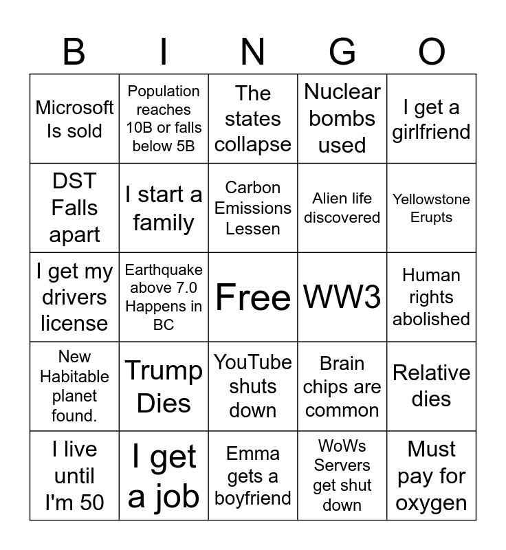 This bingo card has a free space and 24 words: Trump Dies, I get a job, Carbon Emissions Lessen, I live until I'm 50, I get a girlfriend, Microsoft Is sold, DST Falls apart, Population reaches 10B or falls below 5B, WW3, YouTube shuts down, Alien life discovered, I get my drivers license, Brain chips are common, Relative dies, I start a family, WoWs Servers get shut down, Human rights abolished, The states collapse, Yellowstone Erupts, Earthquake above 7.0 Happens in BC, Must pay for oxygen, New Habitable planet found., Nuclear bombs used and Emma gets a boyfriend.