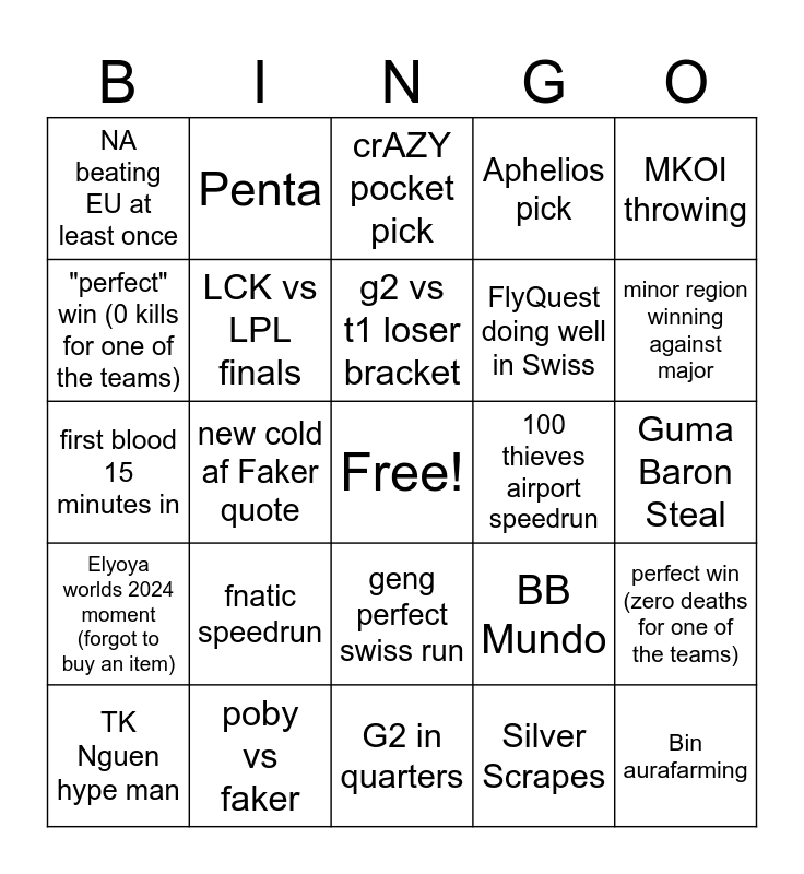 This bingo card has a free space and 24 words: fnatic speedrun, poby vs faker, g2 vs t1 loser bracket, TK Nguen hype man, MKOI throwing, NA beating EU at least once, "perfect" win (0 kills for one of the teams), Penta, 100 thieves airport speedrun, geng perfect swiss run, FlyQuest doing well in Swiss, first blood 15 minutes in, BB Mundo, perfect win (zero deaths for one of the teams), LCK vs LPL finals, Silver Scrapes, Guma Baron Steal, crAZY pocket pick, minor region winning against major, new cold af Faker quote, Bin aurafarming, Elyoya worlds 2024 moment (forgot to buy an item), Aphelios pick and G2 in quarters.
