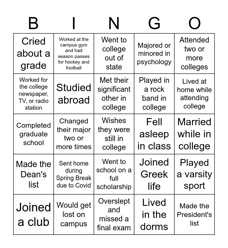 This bingo card has a free space and 35 words: Started at Community College, Worked full-time while attending college, Is still close friends with their college roommate, Studied abroad, Went to school on a full scholarship, Majored or minored in psychology, Worked for the college newspaper, TV, or radio station, Played in the college band, Met their significant other in college, Is currently enrolled in a college program or course, Completed graduate school, Attended two or more colleges, Ate Ramon Noodles several days a week, Took out student loans to pay for college, Cried about a grade, Fell asleep in class, Lived in the dorms, Changed their major two or more times, Made the Dean's list, Made the President's list, Joined Greek life, Joined a club, Played a varsity sport, Would get lost on campus, Went to college out of state, Lived at home while attending college, Started college in their 20's, Stayed up all night to finish a project that was due, Played in a rock band in college, Married while in college, Scared of heights but slept on the top bed of three stacked dorm beds, Overslept and missed a final exam, Sent home during Spring Break due to Covid, Worked at the campus gym and had season passes for hockey and football and Played in a club sport.