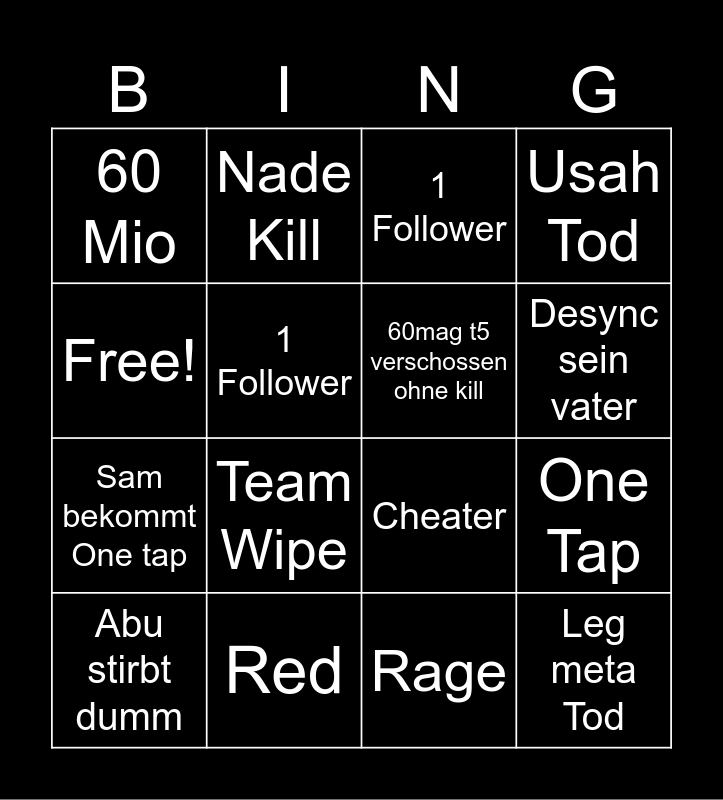 This bingo card has 16 words: Red, One Tap, 1 Follower, 60 Mio, Sam bekommt One tap, Nade Kill, Cheater, Rage, Free!, 1 Follower, Abu stirbt dumm, Usah Tod, Team Wipe, Desync sein vater, 60mag t5 verschossen ohne kill and Leg meta Tod.