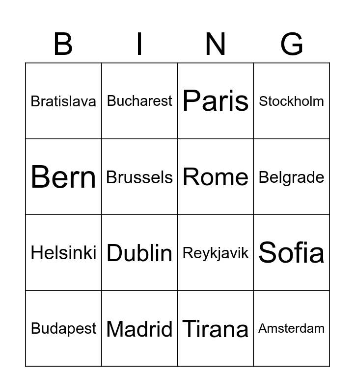 This bingo card has 23 words: Amsterdam, Athens, Belgrade, Berlin, Bern, Bratislava, Brussels, Bucharest, Budapest, Copenhagen, Dublin, Helsinki, Lisbon, Luxembourg, Madrid, Oslo, Paris, Reykjavik, Rome, Sofia, Stockholm, Tirana and Vienna.