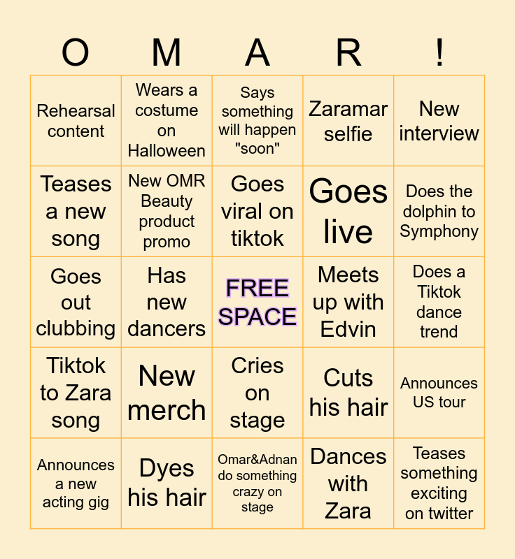 This bingo card has a free space and 59 words: Cuts his hair, Dyes his hair, Visits Adam the hair stylist, Tiktok to Zara song, Dances with Zara, Promises to do a bus tour, New OMR Beauty product promo, Zaramar duet, Goes live, Leaves Sweden before tour starts, Zaramar selfie, Zaramar GRWM, Teases a new song, Releases a new song, Sings a new song live, Rehearsal content, Teases something exciting on twitter, New interview, New photoshoot, Goes viral on tiktok, Meets up with Edvin, Says something will happen "soon", Announces a new acting gig, Announces US tour, Vague or mysterious tweet, Announces new album title, Edmar in Berlin, Edmar go live, Does the dolphin to Symphony, Joel films for a tour movie, New dance break, Wears eyeliner, Forgets what city he's in, Takes his shirt off on stage, Wears a costume on Halloween, Posts something on his Tiktok VIP bulletin board, Defends someone on Twitter, Has new dancers, Says "this is crazy/insane" while on stage, Goes out clubbing, Gym selfie, New merch, Does a Tiktok dance trend, Eats pasta, Hard launch, Birthday post, Covers a new song, Acoustic singing post, Cries on stage, Omar&Adnan do something crazy on stage, New choreo, Does a Tiktok with his dancers, Announces new album release date, Grumpy traveling photo, We lose our minds over a picture he posts, Cuts his hair, Cuts his hair, Cuts his hair and Cuts his hair.