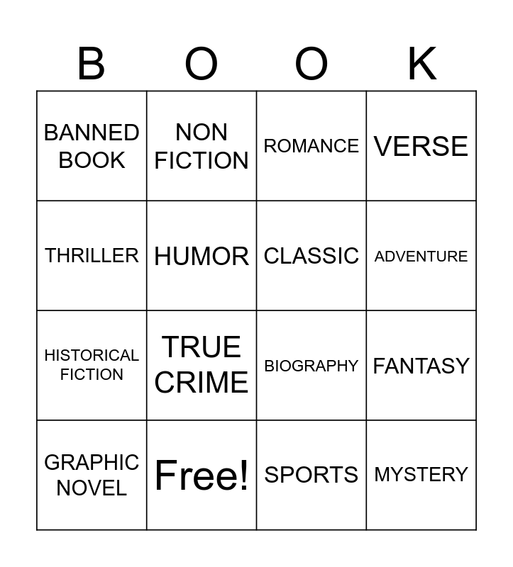 This bingo card has 16 words: Free!, FANTASY, ROMANCE, BANNED BOOK, HISTORICAL FICTION, NON FICTION, BIOGRAPHY, SPORTS, THRILLER, HUMOR, GRAPHIC NOVEL, VERSE, TRUE CRIME, ADVENTURE, CLASSIC and MYSTERY.