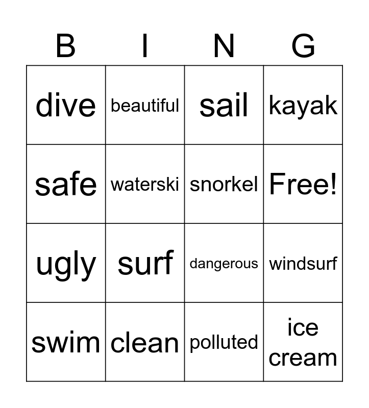 This bingo card has 17 words: polluted, swim, sail, dive, surf, kayak, windsurf, snorkel, Free!, waterski, clean, dangerous, safe, beautiful, ugly, beach and ice cream.