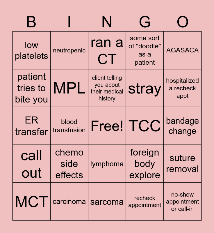 This bingo card has a free space and 24 words: chemo side effects, carcinoma, client telling you about their medical history, MCT, AGASACA, low platelets, patient tries to bite you, neutropenic, TCC, lymphoma, stray, ER transfer, foreign body explore, suture removal, MPL, recheck appointment, bandage change, ran a CT, hospitalized a recheck appt, blood transfusion, no-show appointment or call-in, call out, some sort of "doodle" as a patient and sarcoma.