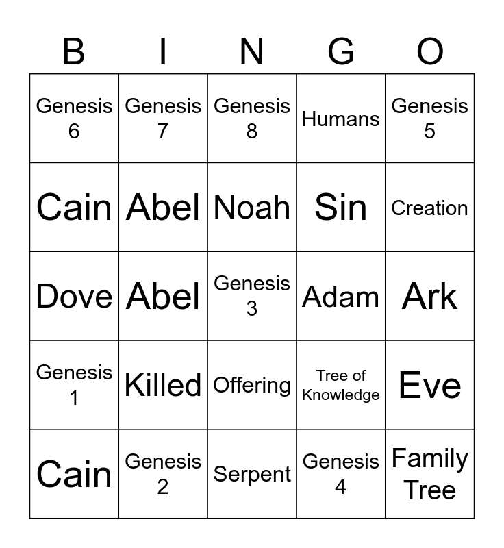 This bingo card has 25 words: Genesis 1, Genesis 2, Genesis 3, Genesis 4, Genesis 5, Genesis 6, Genesis 7, Genesis 8, Adam, Eve, Cain, Abel, Serpent, Tree of Knowledge, Creation, Cain, Abel, Noah, Sin, Ark, Dove, Killed, Offering, Humans and Family Tree.