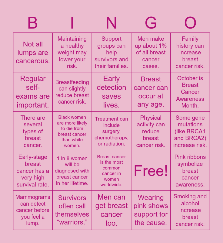 This bingo card has 25 words: 1 in 8 women will be diagnosed with breast cancer in her lifetime., Men can get breast cancer too., Early detection saves lives., Mammograms can detect cancer before you feel a lump., Family history can increase breast cancer risk., Not all lumps are cancerous., Regular self-exams are important., Maintaining a healthy weight may lower your risk., Physical activity can reduce breast cancer risk., Breast cancer is the most common cancer in women worldwide., Breast cancer can occur at any age., There are several types of breast cancer., Free!, Pink ribbons symbolize breast cancer awareness., Breastfeeding can slightly reduce breast cancer risk., Smoking and alcohol increase breast cancer risk., Some gene mutations (like BRCA1 and BRCA2) increase risk., Support groups can help survivors and their families., October is Breast Cancer Awareness Month., Black women are more likely to die from breast cancer than white women., Treatment can include surgery, chemotherapy, or radiation., Survivors often call themselves “warriors.”, Early-stage breast cancer has a very high survival rate., Men make up about 1% of all breast cancer cases. and Wearing pink shows support for the cause..