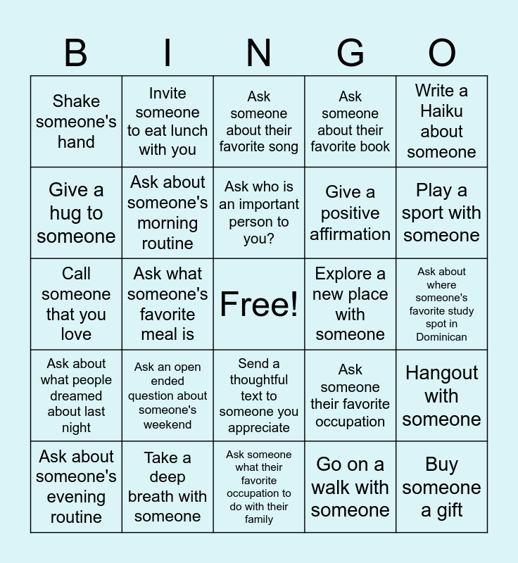 This bingo card has a free space and 24 words: Ask an open ended question about someone's weekend, Take a deep breath with someone, Ask who is an important person to you?, Ask about someone's evening routine, Write a Haiku about someone, Shake someone's hand, Give a hug to someone, Invite someone to eat lunch with you, Explore a new place with someone, Send a thoughtful text to someone you appreciate, Give a positive affirmation, Call someone that you love, Ask someone their favorite occupation, Hangout with someone, Ask about someone's morning routine, Go on a walk with someone, Ask about where someone's favorite study spot in Dominican, Ask someone about their favorite song, Play a sport with someone, Ask what someone's favorite meal is, Buy someone a gift, Ask about what people dreamed about last night, Ask someone about their favorite book and Ask someone what their favorite occupation to do with their family.