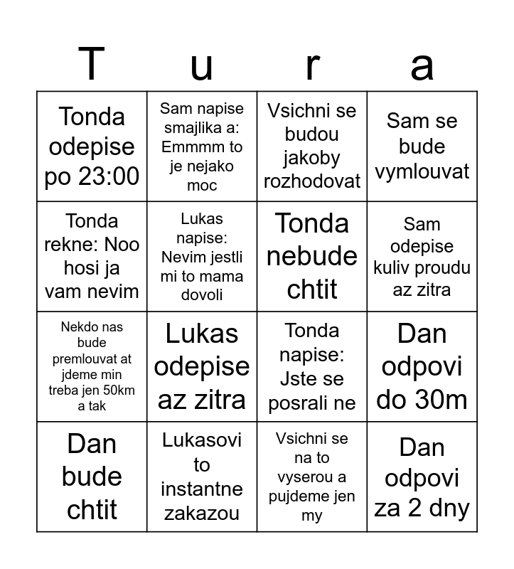 This bingo card has 16 words: Lukasovi to instantne zakazou, Dan odpovi do 30m, Vsichni se budou jakoby rozhodovat, Tonda odepise po 23:00, Nekdo nas bude premlouvat at jdeme min treba jen 50km a tak, Sam napise smajlika a: Emmmm to je nejako moc, Tonda napise: Jste se posrali ne, Vsichni se na to vyserou a pujdeme jen my, Tonda rekne: Noo hosi ja vam nevim, Lukas napise: Nevim jestli mi to mama dovoli, Dan bude chtit, Sam se bude vymlouvat, Lukas odepise az zitra, Sam odepise kuliv proudu az zitra, Tonda nebude chtit and Dan odpovi za 2 dny.