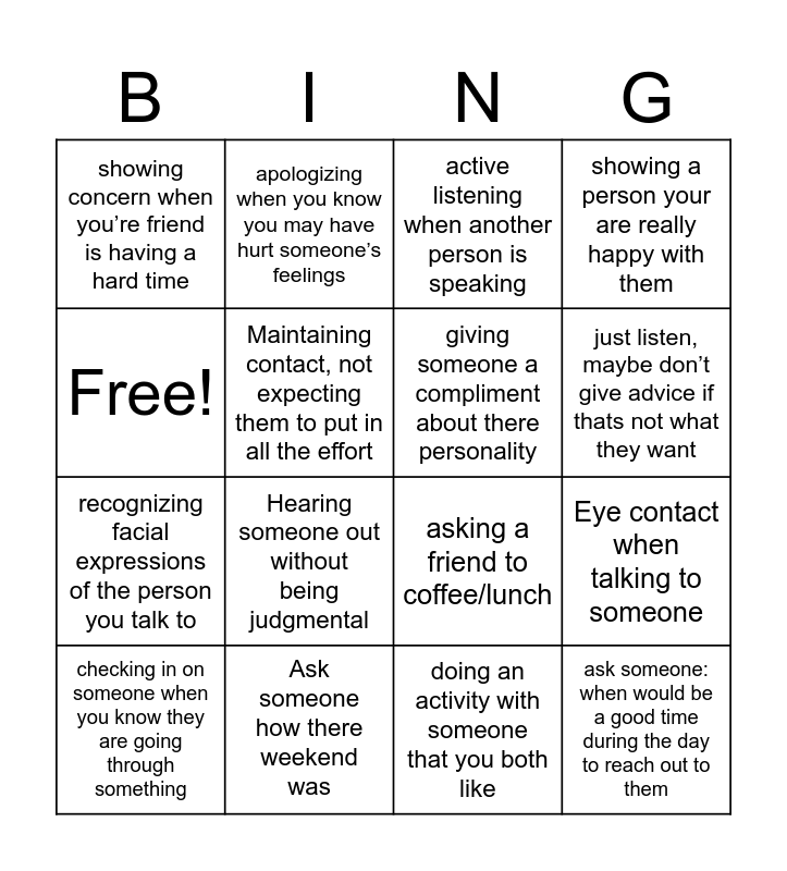 This bingo card has 16 words: Ask someone how there weekend was, Eye contact when talking to someone, active listening when another person is speaking, showing concern when you’re friend is having a hard time, recognizing facial expressions of the person you talk to, apologizing when you know you may have hurt someone’s feelings, asking a friend to coffee/lunch, doing an activity with someone that you both like, Free!, Maintaining contact, not expecting them to put in all the effort, checking in on someone when you know they are going through something, showing a person your are really happy with them, Hearing someone out without being judgmental, just listen, maybe don’t give advice if thats not what they want, giving someone a compliment about there personality and ask someone: when would be a good time during the day to reach out to them.