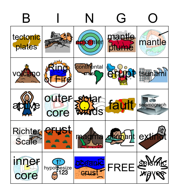 This bingo card has 24 images and 25 words: crust, oceanic crust, continental crust, inner core, mantle, tectonic plates, volcano, earthquake, fault, magma, erupt, active, dormant, extinct, Ring of Fire, seismic waves, seismograph, epicenter, tsunami, outer core, solar winds, hypothesize, Richter Scale, mantle plume and FREE.