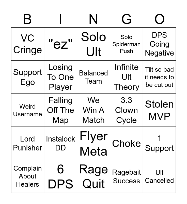 This bingo card has a free space and 24 words: Instalock DD, 6 DPS, Balanced Team, Complain About Healers, DPS Going Negative, VC Cringe, Support Ego, "ez", 3.3 Clown Cycle, Flyer Meta, Infinite Ult Theory, Weird Username, Choke, 1 Support, Losing To One Player, Ragebait Success, Stolen MVP, Solo Ult, Tilt so bad it needs to be cut out, Falling Off The Map, Ult Cancelled, Lord Punisher, Solo Spiderman Push and Rage Quit.