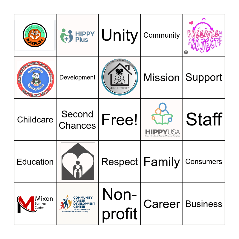 This bingo card has 9 images, a free space and 15 words: Respect, Mission, Childcare, Family, Consumers, Development, Career, Staff, Unity, Support, Second Chances, Business, Education, Community and Non-profit.